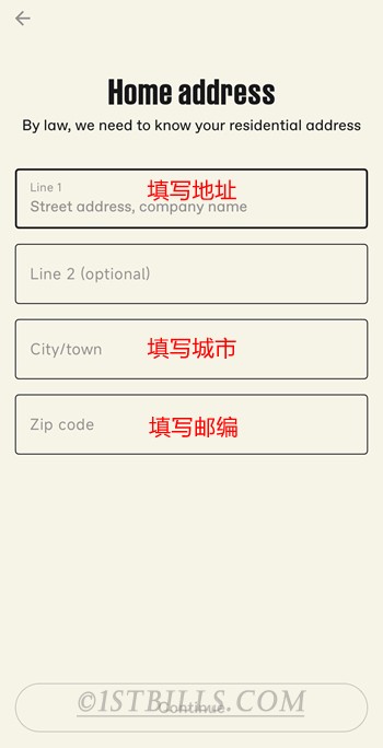之后需要填写你的居住地址,城市和邮政编码,地址这里使用中文填写就行了,然后点击“Continue”进入下一步