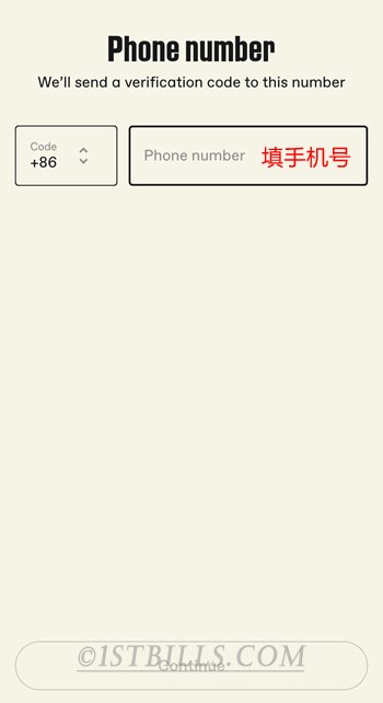 这一步是验证手机号,手机号支持中国手机号,电话区号选择+86,然后填写你的手机号,就可以点击“Continue”了,然后你的手机会收到一条6位数字的短信验证码,填写短信验证码进行手机号码验证